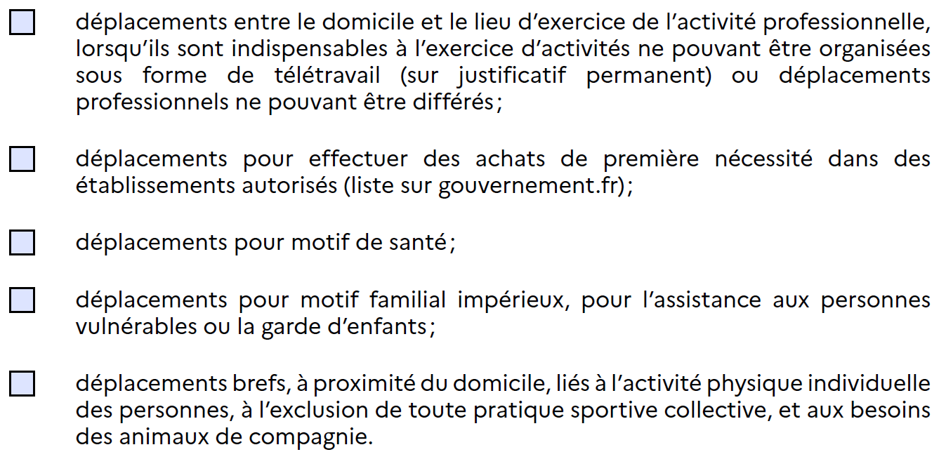 Conclusion : les déplacements à plusieurs dans une même voiture ne sont pas interdits. Toutefois, ils doivent se faire en cas de « nécessité absolue », et strictement dans le cadre des cas « énumérés par l’attestation de déplacement dérogatoire », c’est-à-dire :
