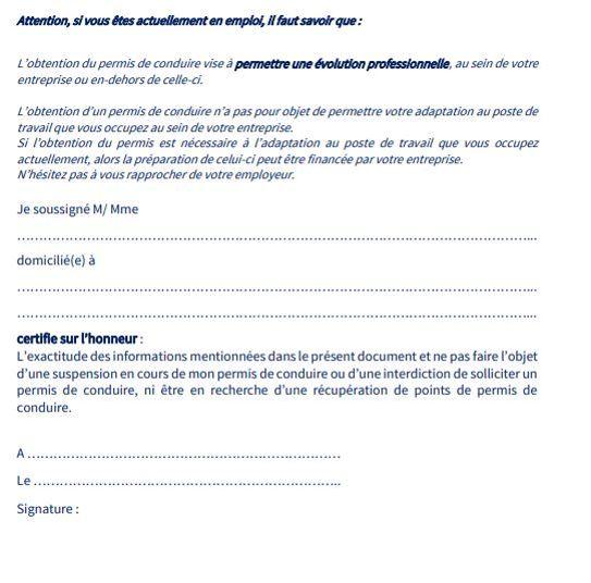 Une attestation sur l’honneur doit également être fournie par le candidat désireux de financer son permis de conduire par ses droits CPF à l’organisme. Le futur conducteur doit y certifier que l’obtention du titre contribue à la réalisation d’un projet professionnel ou à favoriser la sécurisation de son parcours professionnel. Il doit également garantir qu’il ne fait pas l’objet d’une suspension ou d’une interdiction de son permis de conduire.