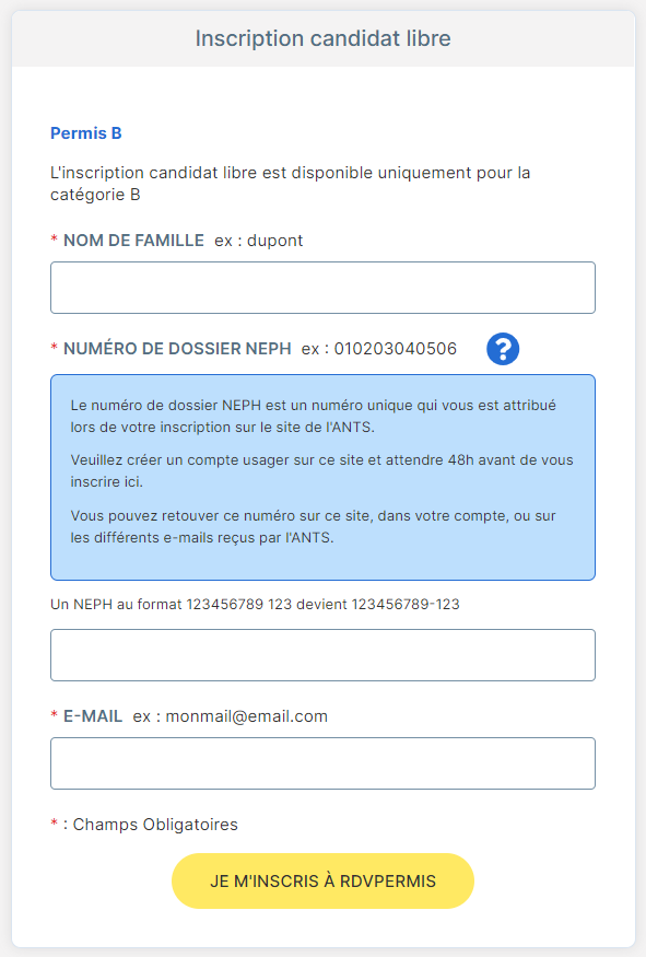 Dans ce deuxième cas, le candidat doit renseigner son nom de famille, son adresse e-mail, ainsi que son numéro de dossier NEPH (un numéro unique attribué lors de son inscription sur le site de l’ANTS, l’agence nationale des titres sécurisés).