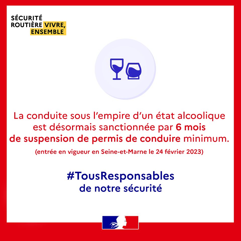 • toute personne conduisant sous l’empire d’un état alcoolique à un taux supérieur à 0,40 mg/litre d’air expiré s’expose à une sanction de 6 mois de suspension de permis de conduire